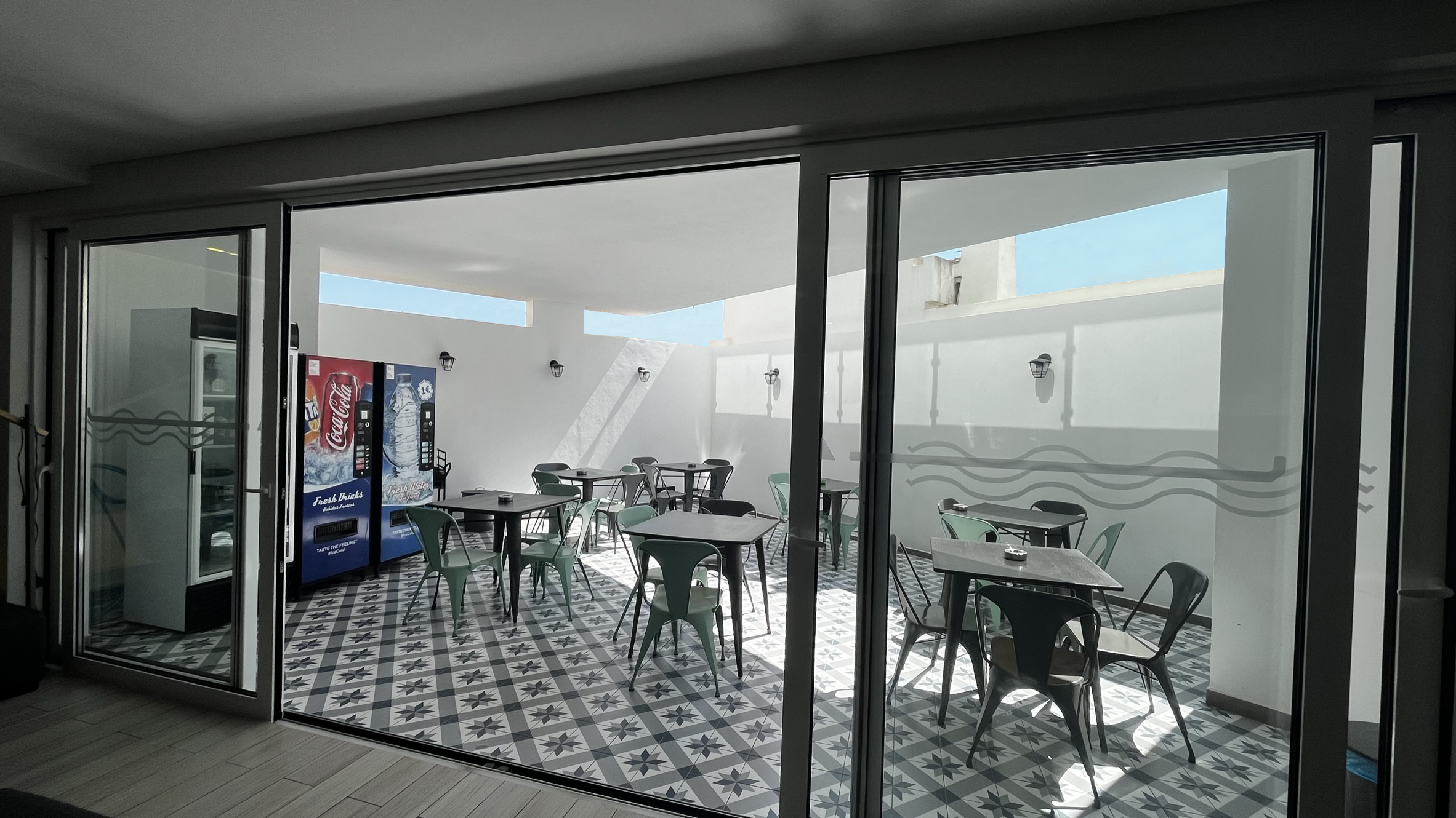 dorms and private double rooms, catering to different budgets and preferences. The terrace,